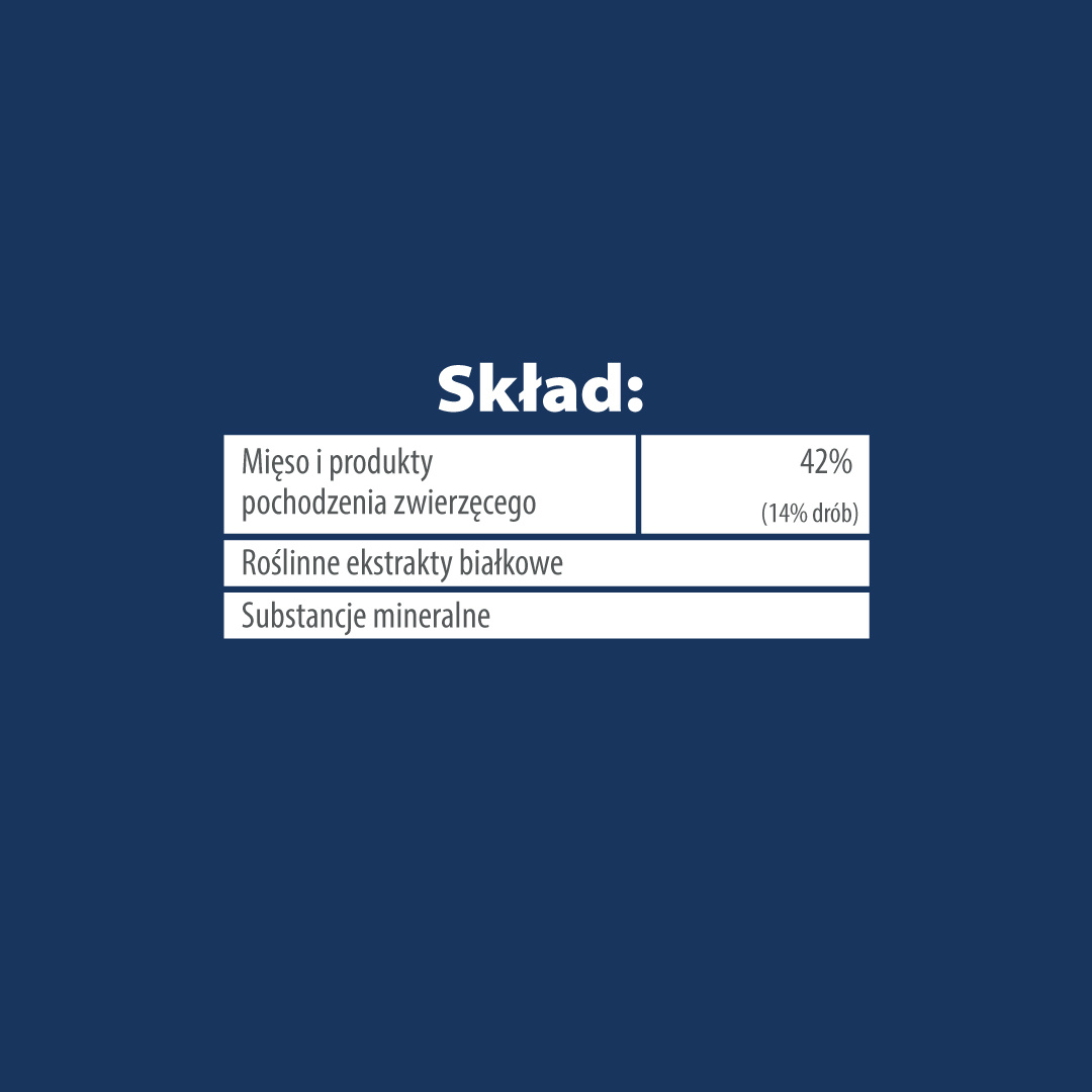 Skład: 52% mięsa i produktów pochodzenia zwierzęcego (14% drób), roślinne ekstrakty białkowe, substancje mineralne.