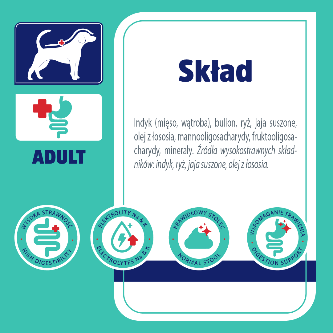 - Pełnoporcjowy posiłek dietetyczny w postaci mokrej karmy dla psów dorosłych wszystkich ras z zaburzeniami: czynności trzustki, trawienia oraz wchłaniania jelitowego