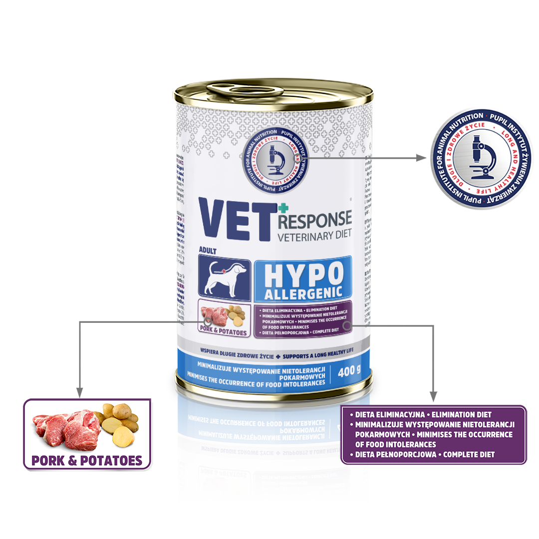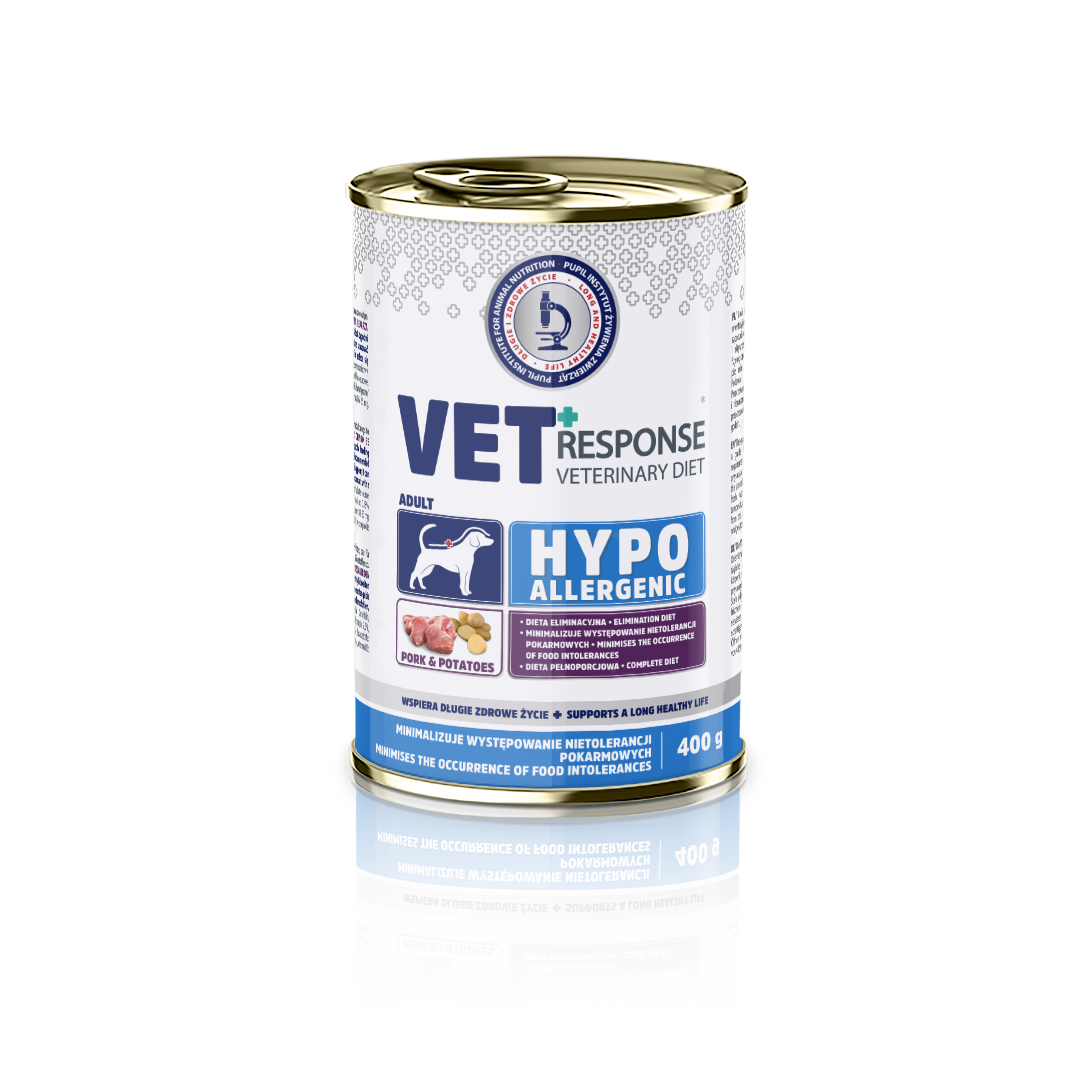 - VET RESPONSE VETERINARY DIET HYPOALLERGENIC (WIEPRZOWINA) to dietetyczna, pełnoporcjowa karma mokra, zalecana dla obniżenia nietolerancji składników i substancji odżywczych.