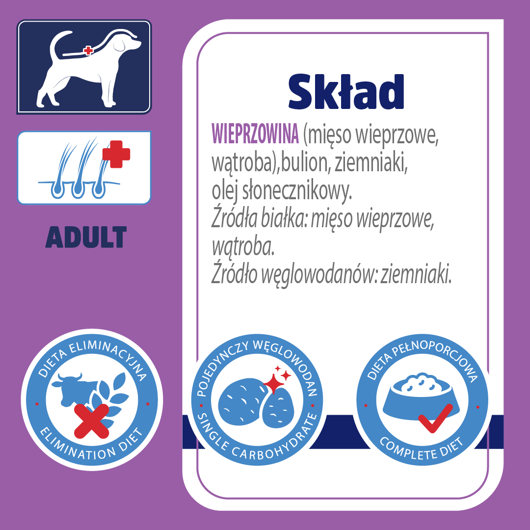 - Pełnoporcjowy posiłek dietetyczny w postaci mokrej karmy zalecany dorosłym psom dla obniżenia nietolerancji składników i substancji odżywczych