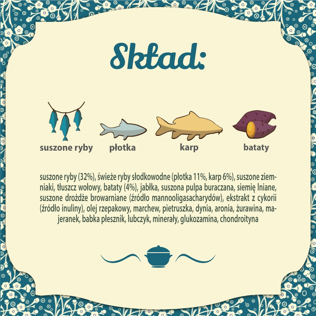 Skład: suszone ryby (32%), świeże ryby słodkowodne (płotka 11%, karp 6%), suszone ziemniaki, tłuszcz wołowy, bataty (4%), jabłka, suszona pulpa buraczana, siemię lniane, suszone drożdże browarniane (źródło mannooligasacharydów), ekstrakt z cykorii (źródło inuliny), olej rzepakowy, marchew, pietruszka, dynia, aronia, żurawina, majeranek, babka płesznik, lubczyk, minerały, glukozamina, chondroityna.