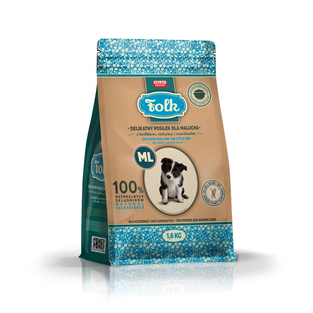 FOLK ML DELIKATNY POSIŁEK DLA MALUCHA Z KRÓLIKIEM, CIELĘCINĄ I MARCHEWKĄ 1,6 KG SUCHA KARMA DLA SZCZENIĄT, MŁODYCH PSÓW ORAZ SUK CIĘŻARNYCH I KARMIĄCYCH