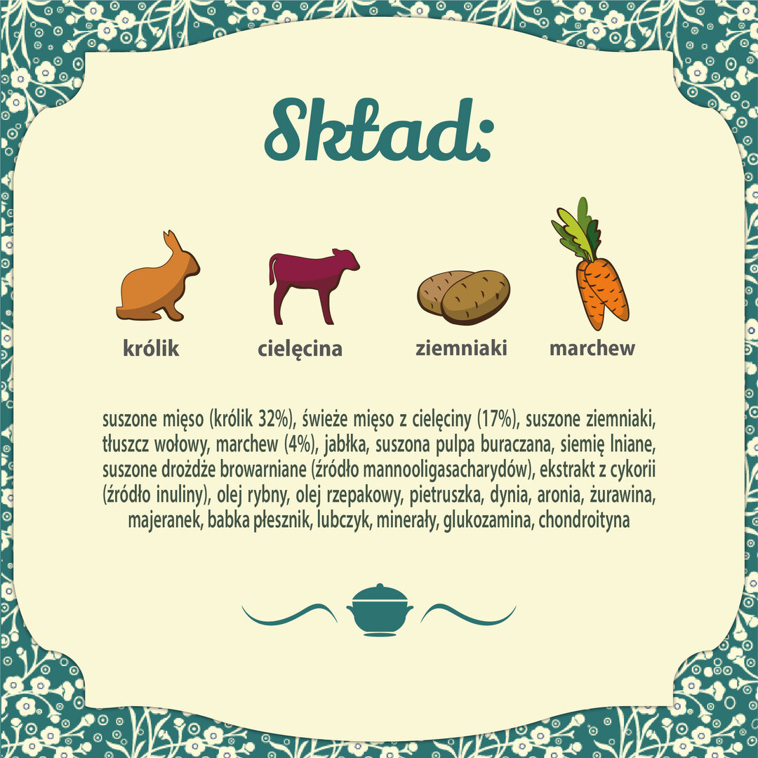 Skład: suszone mięso (królik 32%), świeże mięso z cielęciny (17%), suszone ziemniaki, tłuszcz wołowy, marchew (4%), jabłka, suszona pulpa buraczana, siemię lniane, suszone drożdże browarniane (źródło mannooligosacharydów), ekstrakt z cykorii (źródło inuliny), olej rybny, olej rzepakowy, pietruszka, dynia, aronia, żurawina, majeranek, babka płesznik, lubczyk, minerały, glukozamina, chondroityna.
