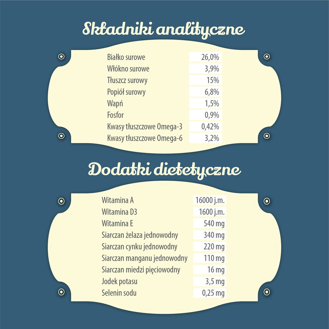 Karma nie zawiera konserwantów, sztucznych dodatków ani barwników. Składniki są w 100% naturalne. Kształt i rozmiar granulek są dopasowane do szczęk psa