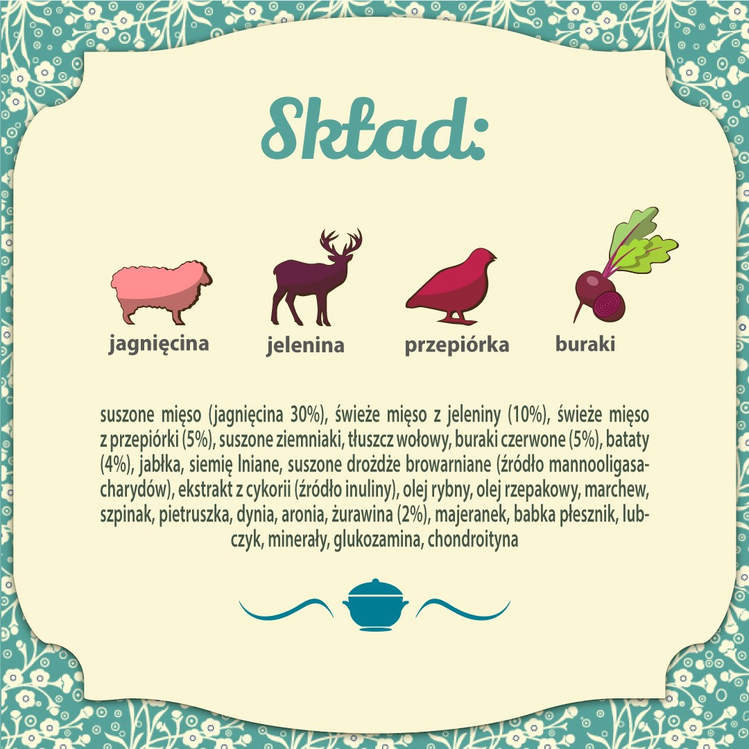 Skład: suszone mięso (jagnięcina 30%), świeże mięso z jeleniny (10%), świeże mięso z przepiórki (5%) suszone ziemniaki, tłuszcz wołowy, buraki czerwone (5%), bataty (4%), jabłka, siemię lniane, suszone drożdże browarniane (źródło mannooligasacharydów), ekstrakt z cykorii (źródło inuliny), olej rybny, olej rzepakowy, marchew, szpinak, pietruszka, dynia, aronia, żurawina (2%), majeranek, babka płesznik, lubczyk, minerały, glukozamina, chondroityna.