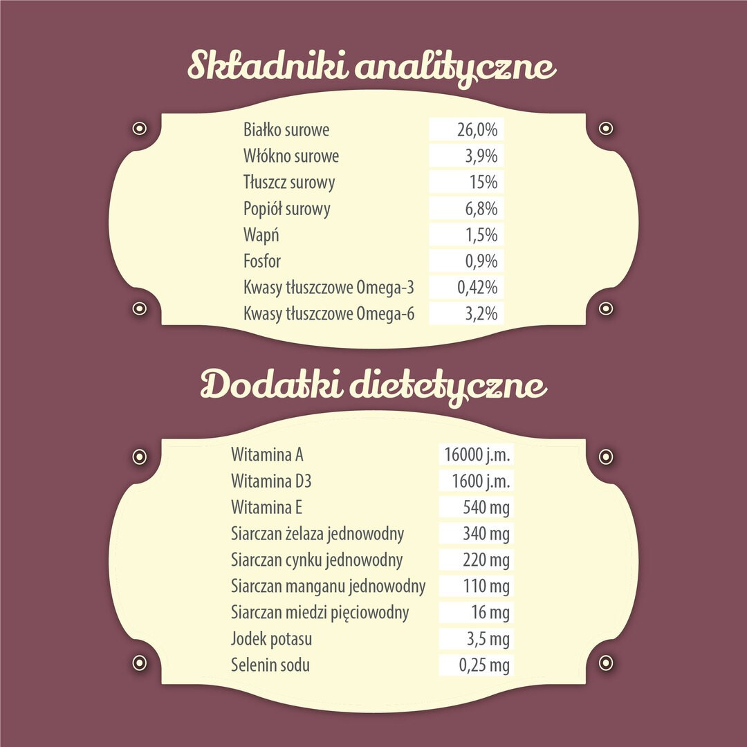 - Wysoka zawartość mięsa królika, jagnięciny i przepiórki