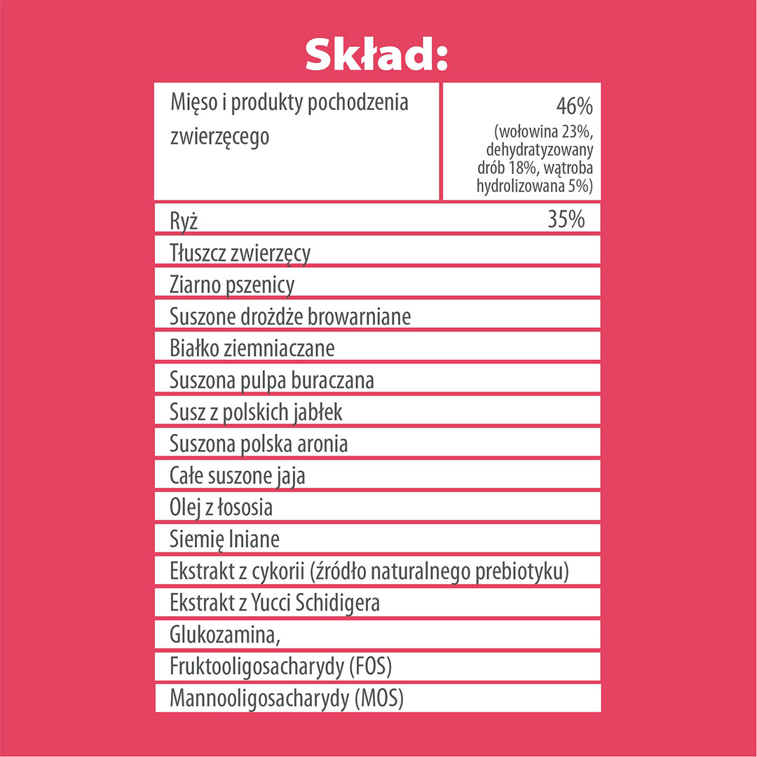 Skład: suszone mięso 46% ( wołowina 23%, dehydratyzowany drób 18%, wątroba hydrolizowana 5%), ryż (35%), tłuszcz zwierzęcy, ziarno pszenicy, suszone drożdże browarniane , białko ziemniaczane, suszona pulpa buraczana, susz z polskich jabłek, suszona polska aronia, całe suszone jaja, olej z łososia, siemię lniane, ekstrakt z cykorii (źródło naturalnego prebiotyku), ekstrakt z Yucci Schidigera, glukozamina, fruktooligosacharydy (FOS), mannooligosacharydy (MOS).