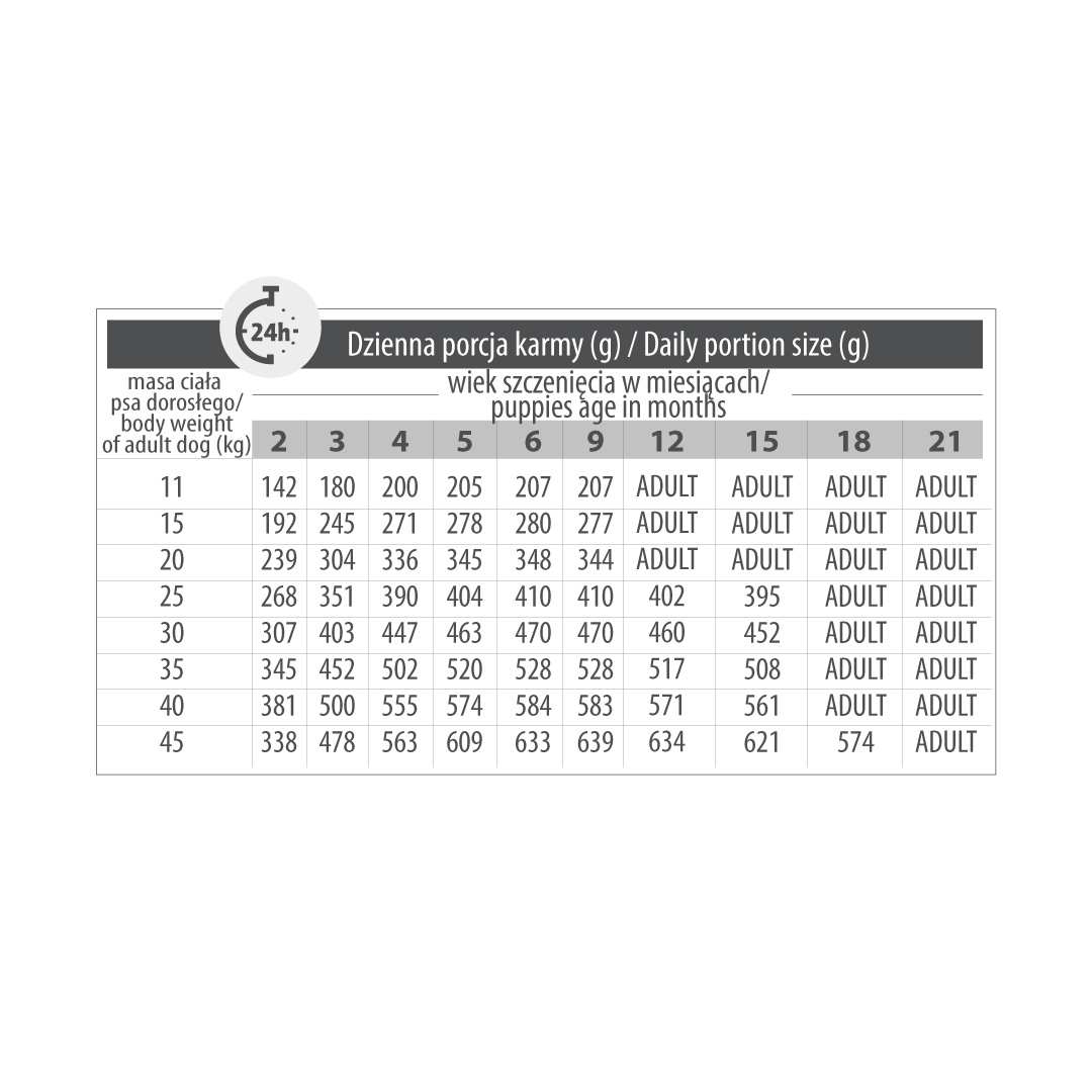 - W 100% kompletne pożywienie w postaci suchej karmy dla szczeniąt i rosnących psów ras średnich i dużych oraz suk ciężarnych i karmiących