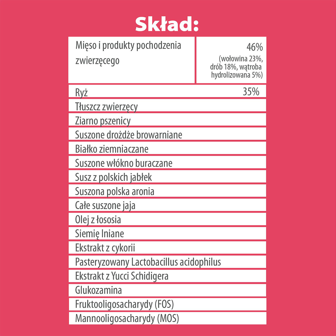 Skład: suszone mięso 46% ( wołowina 23%, dehydratyzowany drób 18%, wątroba hydrolizowana 5%), ryż (35%), tłuszcz zwierzęcy, ziarno pszenicy, suszone drożdże browarniane , białko ziemniaczane, suszona pulpa buraczana, susz z polskich jabłek, suszona polska aronia, całe suszone jaja, olej z łososia, siemię lniane, ekstrakt z cykorii (źródło naturalnego prebiotyku), ekstrakt z Yucci Schidigera, glukozamina, fruktooligosacharydy (FOS), mannooligosacharydy (MOS).