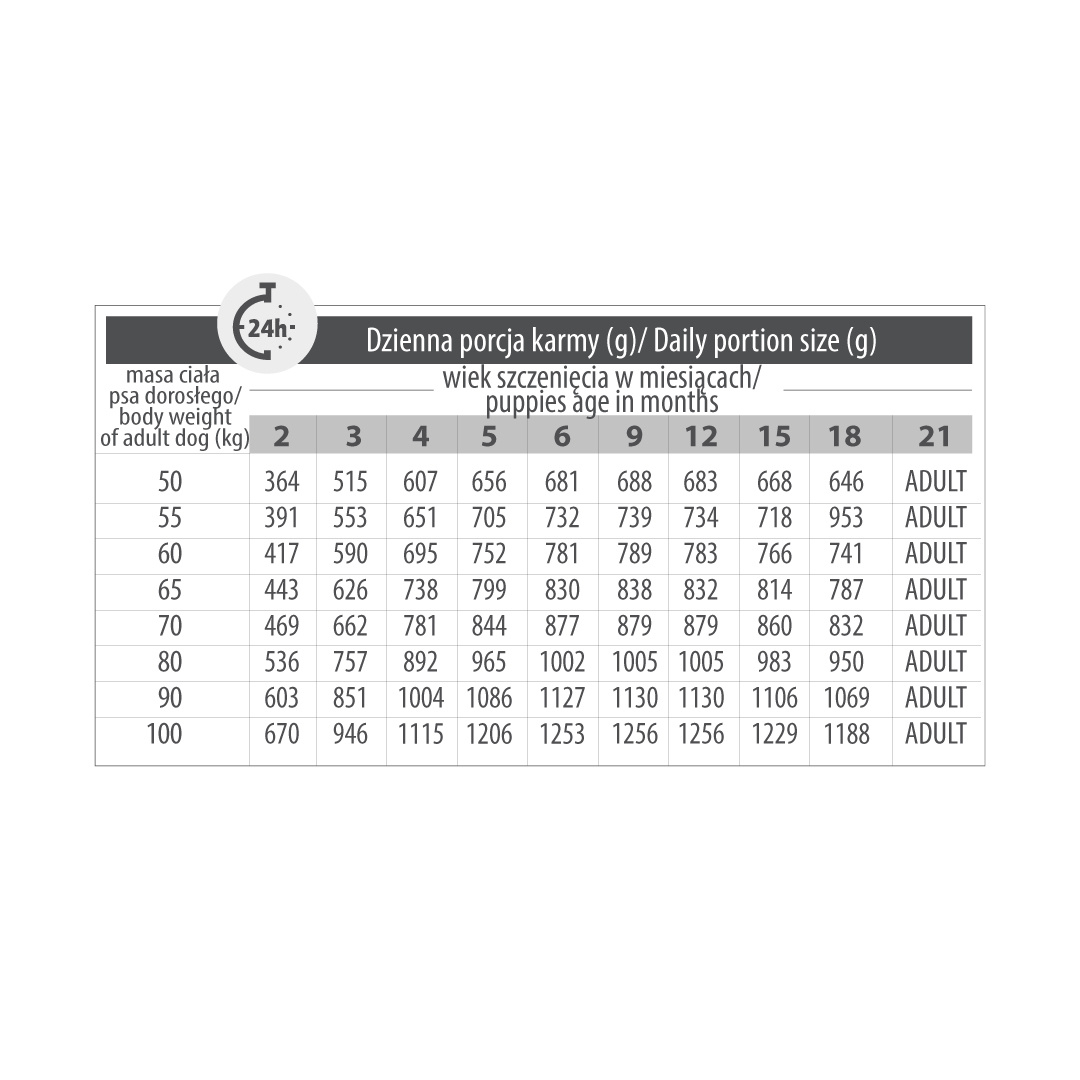 - W 100% kompletne pożywienie w postaci suchej karmy dla szczeniąt psów ras dużych i olbrzymich oraz suk ciężarnych i karmiących
