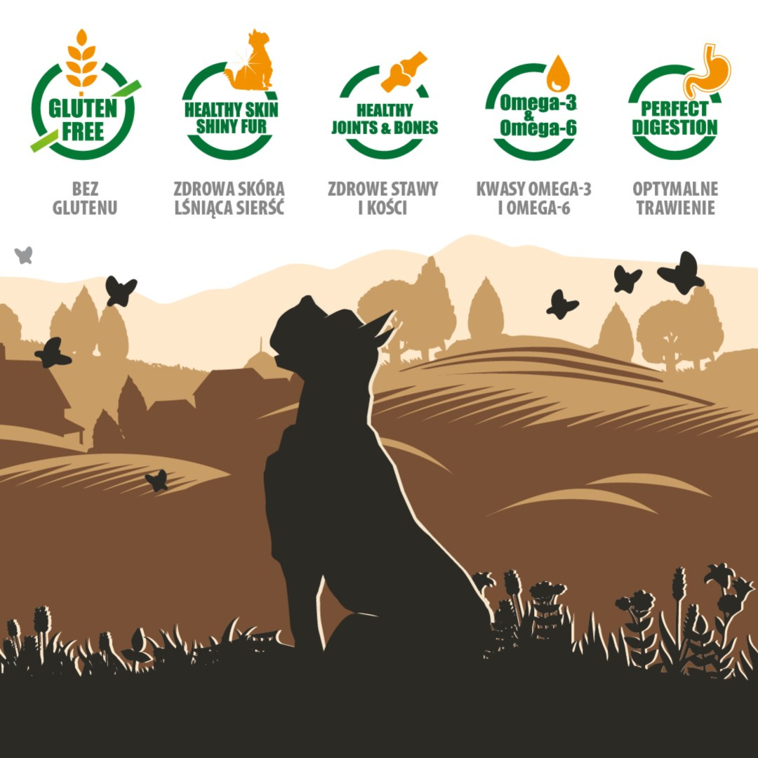 Receptura zapewnia odpowiedni stosunek kwasów tłuszczowych Omega-6 i Omega-3, poprawiających kondycję skóry i sierści. Optymalna zawartość włókna wpływa korzystnie na mikrobiom przewodu pokarmowego.