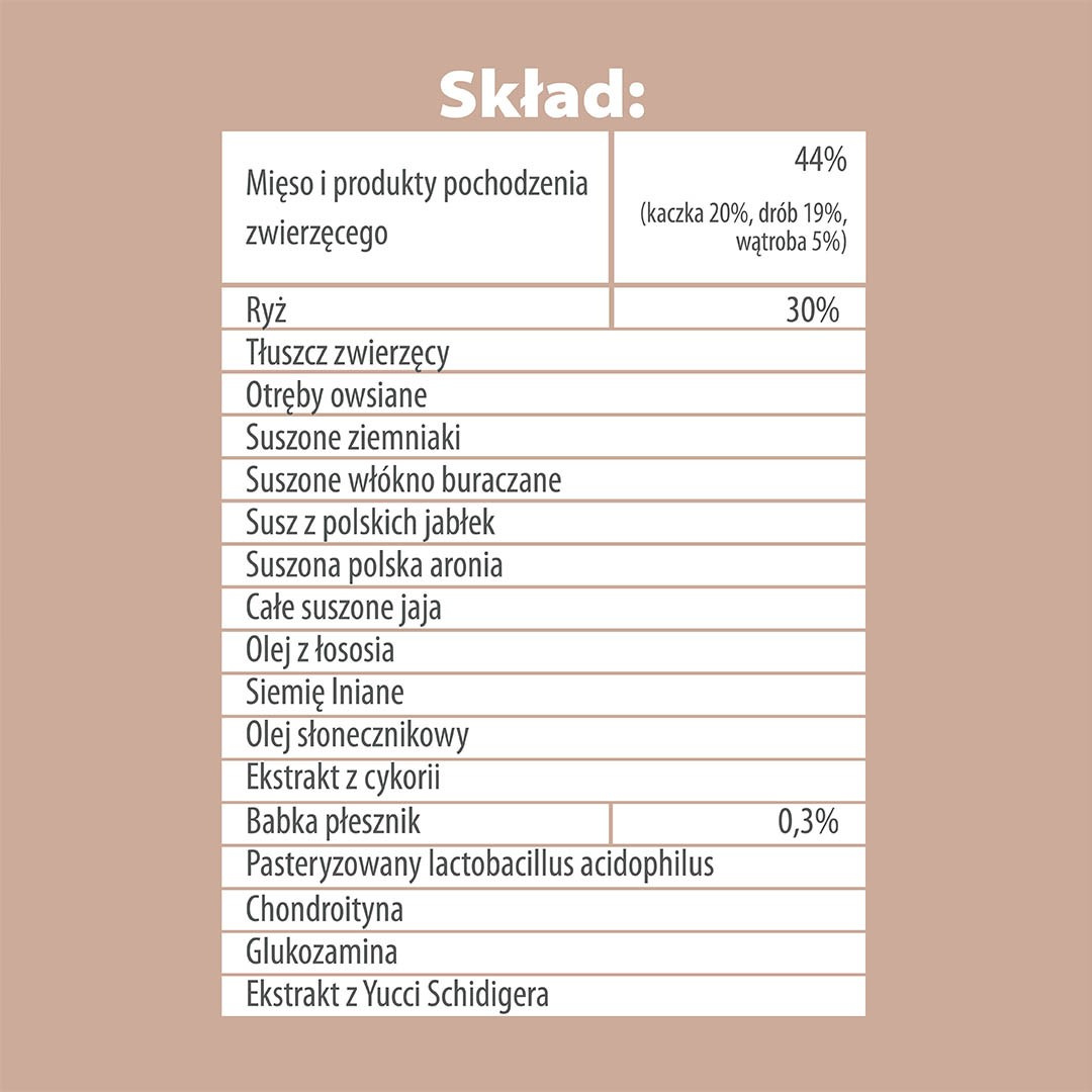 Skład: suszone mięso 44% (gęś 20%, drób 19%, wątroba 5%), ryż 30%, suszone ziemniaki, tłuszcz drobiowy, otręby owsiane, suszone włókno buraczane, suszona polska aronia, susz z polskich jabłek, całe suszone jaja, olej z łososia, siemię lniane, olej słonecznikowy, ekstrakt z cykorii, babka płesznik 0,3%, chondroityna, glukozamina, ekstrakt z Yucci Schidigera.