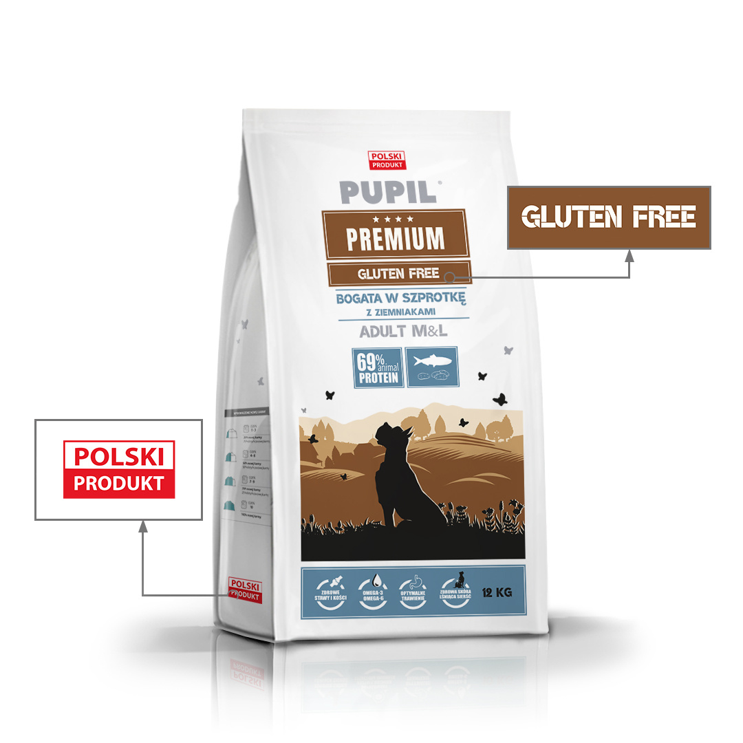 - PUPIL PREMIUM M&L to pełnoporcjowa sucha karma dla dorosłych psów ras średnich i dużych, idealna dla psów z nietolerancją glutenu lub alergią pokarmową.