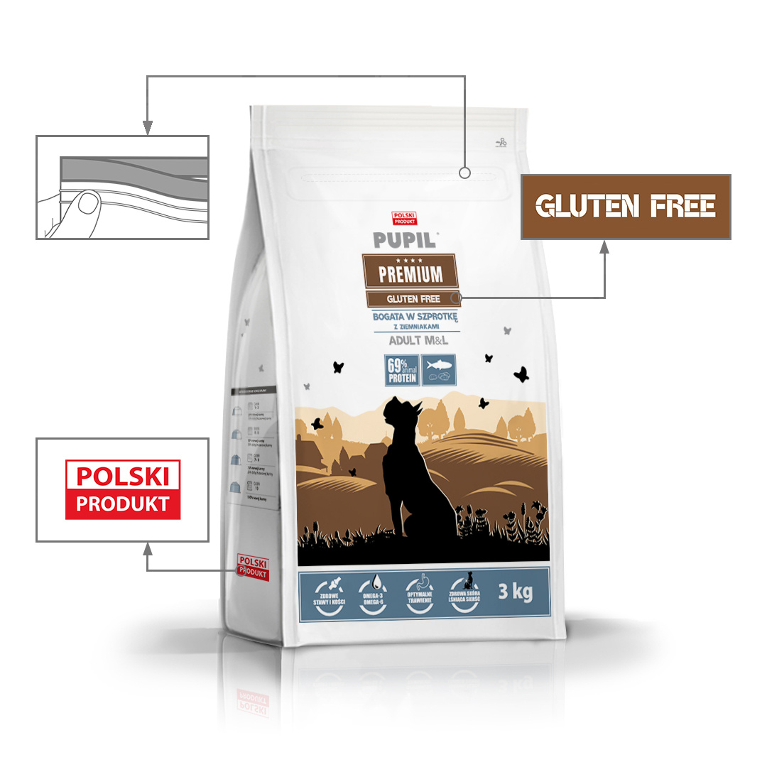 PUPIL PREMIUM M&L to pełnoporcjowa sucha karma dla dorosłych psów ras średnich i dużych, idealna dla psów z nietolerancją glutenu lub alergią pokarmową. Głównym źródłem białka są całe szprotki, które są bogate w tłuszcze, witaminy rozpuszczalne w tłuszczach oraz wielonienasycone kwasy tłuszczowe Omega-3, wspierające zdrowie skóry i sierści.
