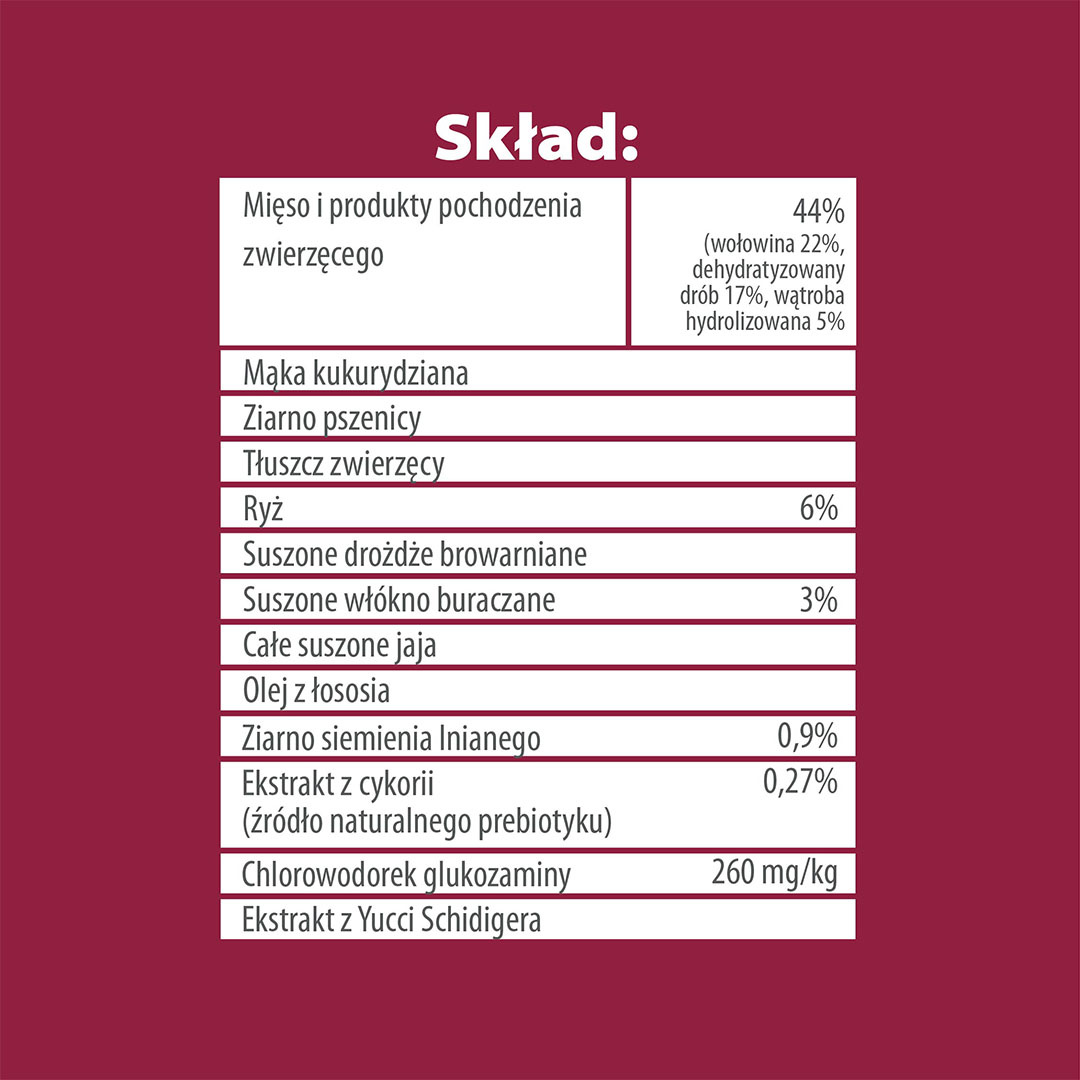 Skład: suszone mięso 44% (wołowina 22%, dehydratyzowany drób 17%, wątroba hydrolizowana 5%), mąka kukurydziana, ziarno pszenicy, tłuszcz zwierzęcy, ryż (6%), suszone drożdże browarniane, suszone włókno buraczane (3%), całe suszone jaja, olej z łososia, ziarno siemienia lnianego (0,9%), ekstrakt z cykorii 0,27% (źródło naturalnego prebiotyku), chlorowodorek glukozaminy (260 mg/kg), ekstrakt z Yucci Schidigera.