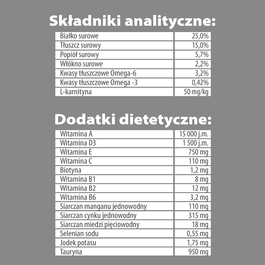 Składniki analityczne: Białko surowe 25,0%; Tłuszcz surowy