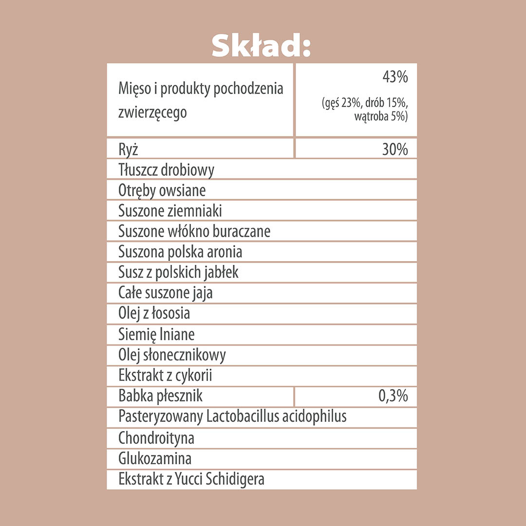 Skład: suszone mięso 43% (gęś 23%, drób 15%, wątroba 5%), ryż 30%, tłuszcz drobiowy, otręby owsiane, suszone ziemniaki, suszone włókno buraczane, suszona polska aronia, susz z polskich jabłek, całe suszone jaja, olej z łososia, siemię lniane, olej słonecznikowy, ekstrakt z cykorii, babka płesznik 0,3%, pasteryzowany Lactobacillus acidophilus, chondroityna, glukozamina, ekstrakt z Yucci Schidigera.