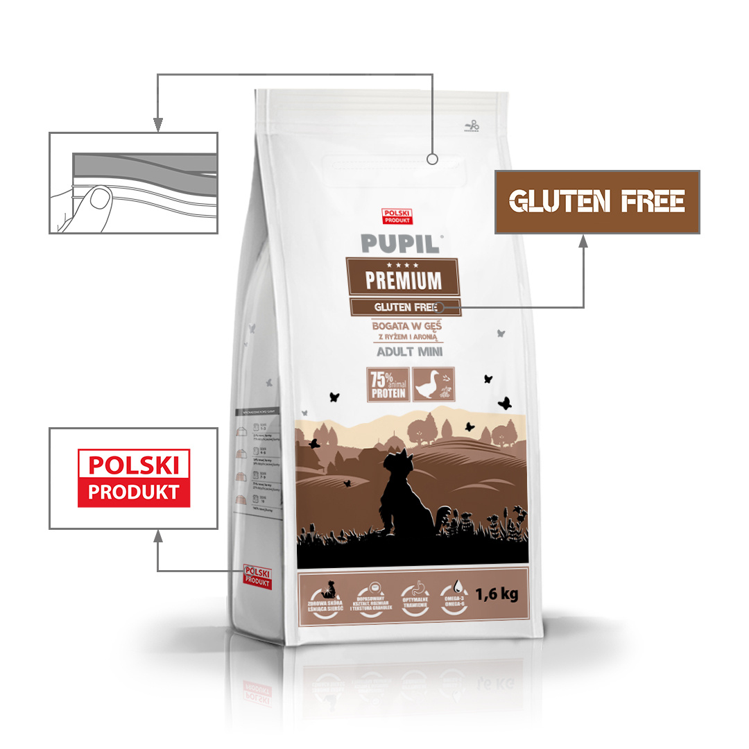 PUPIL PREMIUM MINI to pełnoporcjowa sucha karma dla dorosłych psów ras małych i miniaturowych, idealna dla psów z nietolerancją glutenu. Źródłem łatwostrawnych węglowodanów są polskie ziemniaki i ryż. Wysoki poziom białka uzyskano z mięsa gęsi. Mięso to jest łatwostrawne, bogate w aminokwasy, wielonienasycone kwasy tłuszczowe Omega-6 i Omega-3 oraz witaminy z grupy B i minerały.