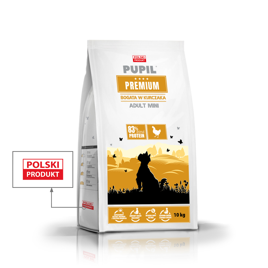 PUPIL Premium Mini to pełnoporcjowa karma sucha dla dorosłych psów ras małych i miniaturowych o masie do 10 kg, od 1 roku życia. Karma bazuje na bogatym w wysokiej jakości białku mięsie z kurczaka. Wysoki wskaźnik strawności zapewnia dobrą przyswajalność substancji odżywczych z pokarmu. Karma odpowiada specyficznym potrzebom żywieniowym psów ras małych i miniaturowych, które mają szybki metabolizm i większe zapotrzebowanie energetyczne.