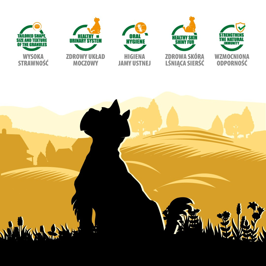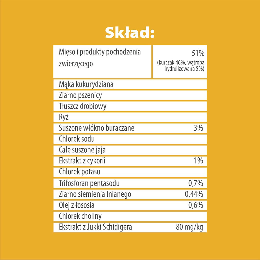 Skład: suszone mięso 51% (kurczak 46%, wątroba hydrolizowana 5%), mąka kukurydziana, ziarno pszenicy, tłuszcz drobiowy, ryż, suszone włókno buraczane (3%), chlorek sodu, całe suszone jaja, ekstrakt z cykorii (1%), chlorek potasu, trifosforan pentasodu (0,7%), ziarno siemienia lnianego (0,44%), olej z łososia (0,6%), chlorek choliny, ekstrakt z Jukki Schidigera (80 mg/kg).