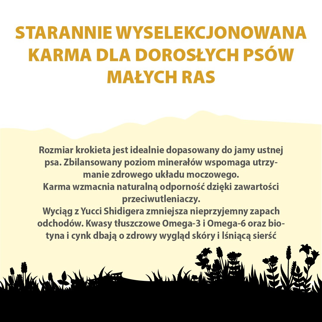 - Pełnoporcjowy posiłek w postaci suchej karmy dla psów dorosłych ras małych i miniaturowych