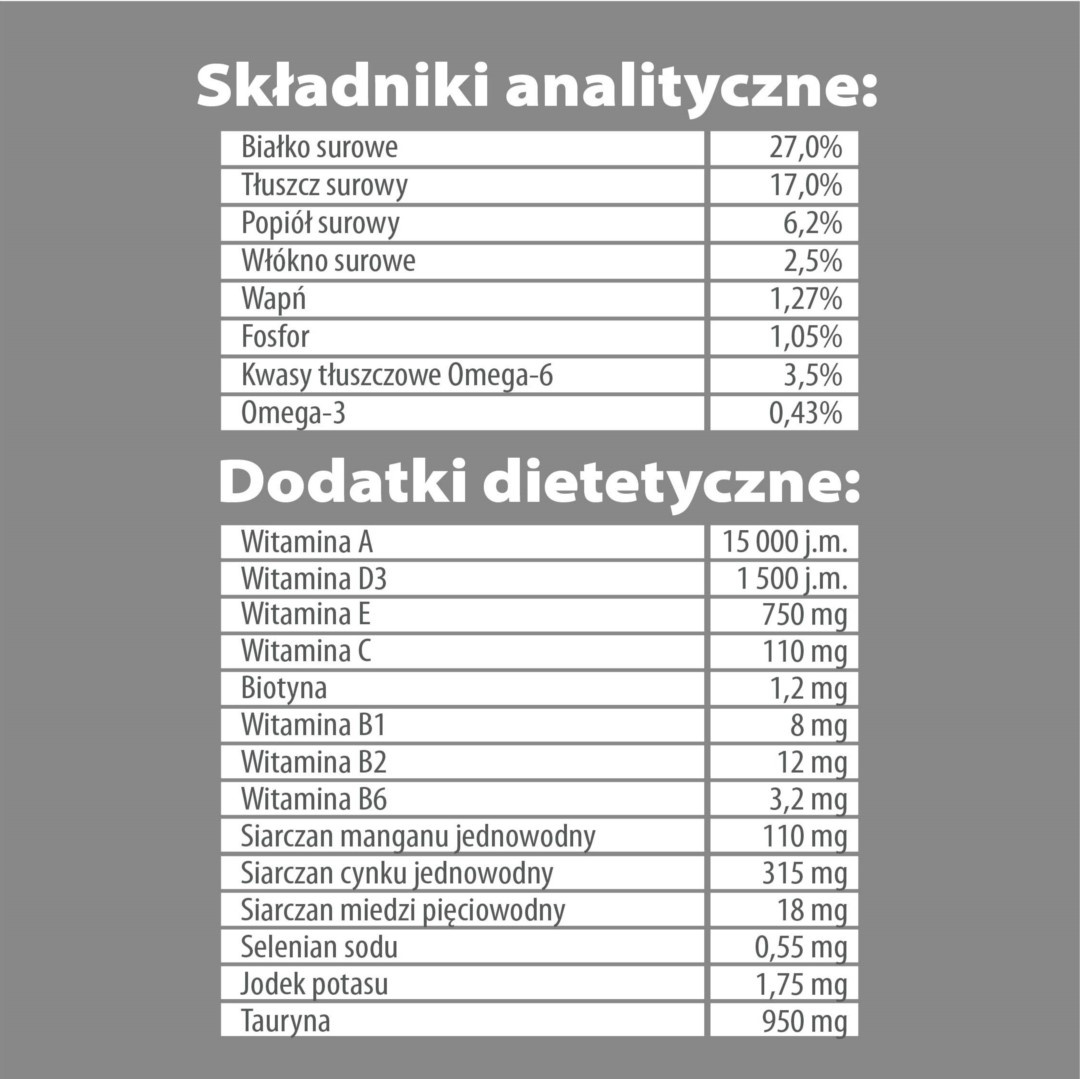 Składniki analityczne: Białko surowe 27,0%; Tłuszcz surowy