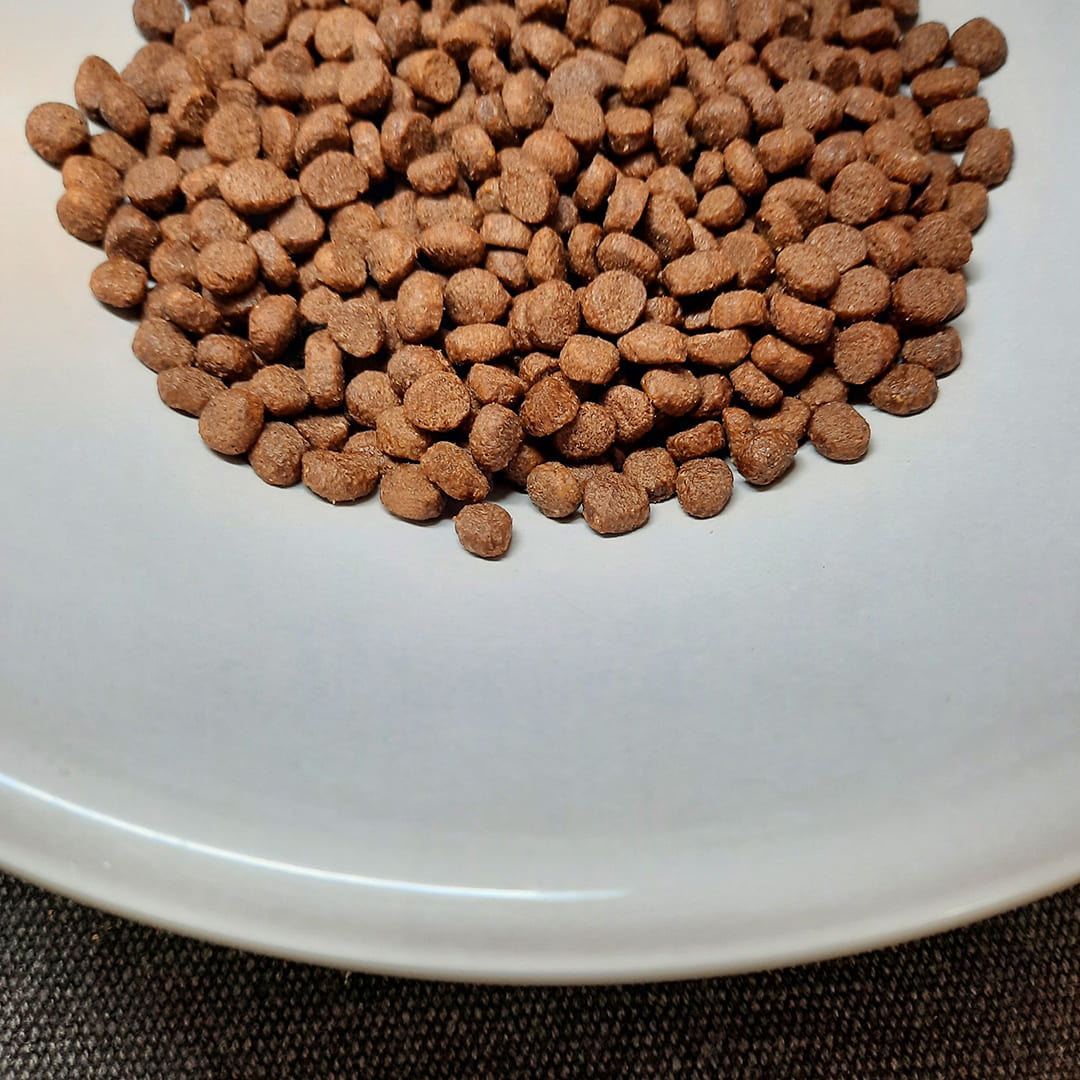 Skład: suszone mięso (wołowina 30%), pszenica, kukurydza, świeże mięso 10%, ryż, tłuszcz zwierzęcy, wątróbka (4%), suszona pulpa buraczana 2,5% (źródło FOS), siemię lniane, ekstrakt z cykorii 0,3% (źródło prebiotyku), olej z łososia, suszone drożdże browarniane (źródło mannooligosacharydów oraz B-glukanów), suszona żurawina, suszone jabłko, suszony pomidor, nasiona babki płesznik, substancje mineralne.