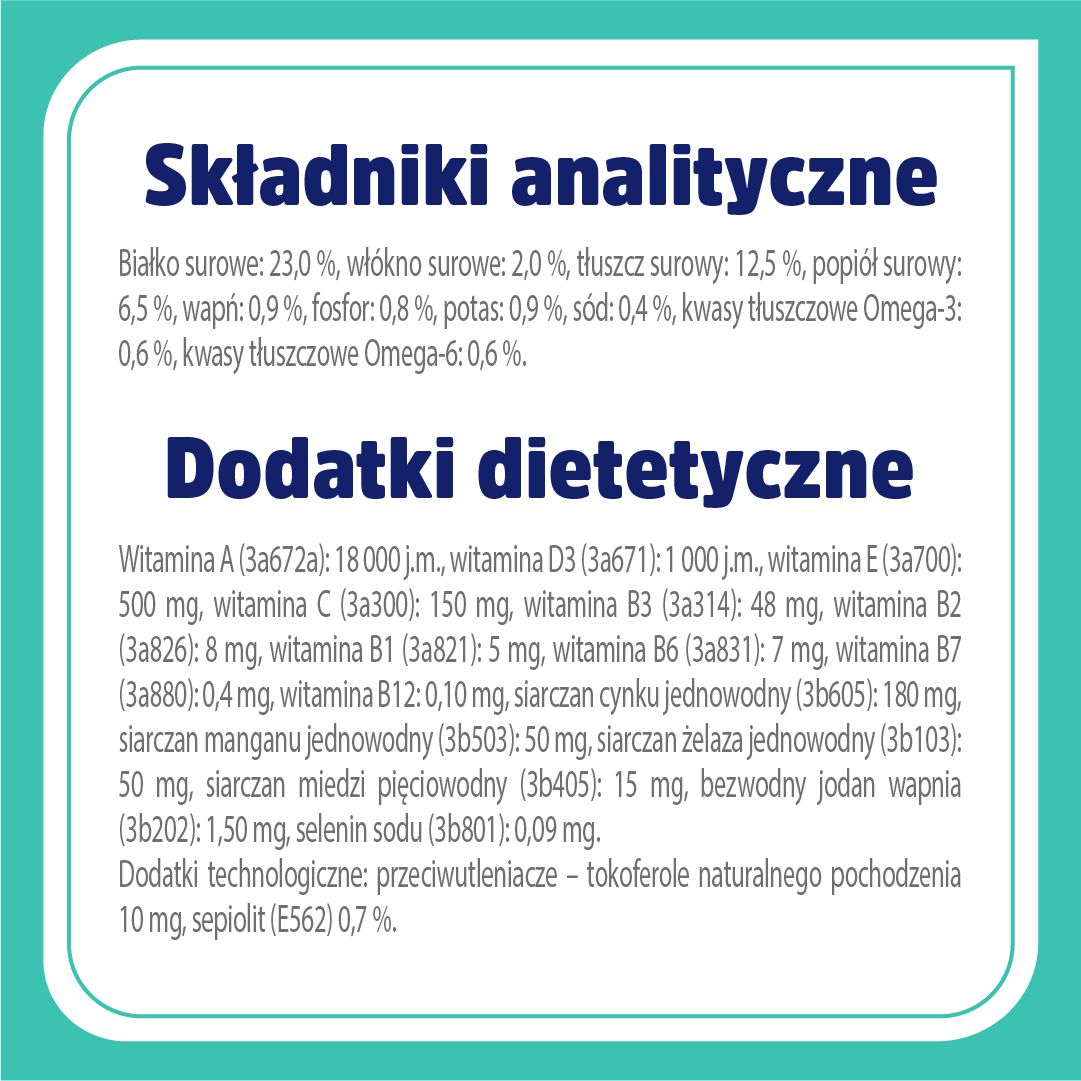 Składniki analityczne: białko surowe: 23,0 %, włókno surowe: 2,0 %, tłuszcz surowy: 12,5 %, popiół surowy: 6,5 %, wapń: 0,9 %, fosfor: 0,8 %, potas: 0,9 %, sód: 0,4 %, kwasy tłuszczowe Omega-3: 0,6 %, kwasy tłuszczowe Omega-6: 0,6 %.