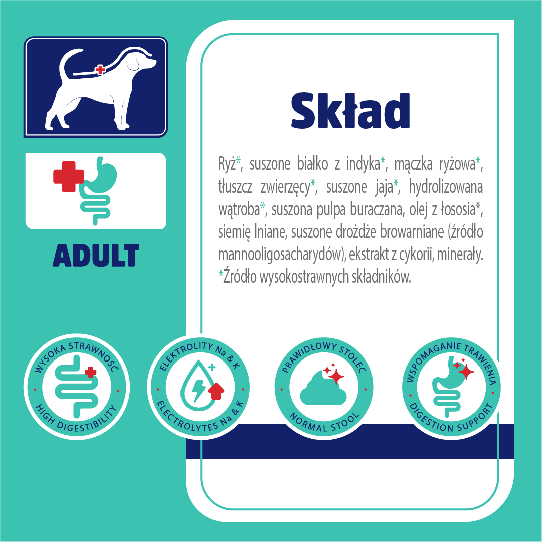 - Pełnoporcjowy posiłek dietetyczny w postaci suchej karmy dla psów dorosłych wszystkich ras z zaburzeniami: czynności trzustki, trawienia oraz wchłaniania jelitowego orazwyrównywania zaburzeń trawienia