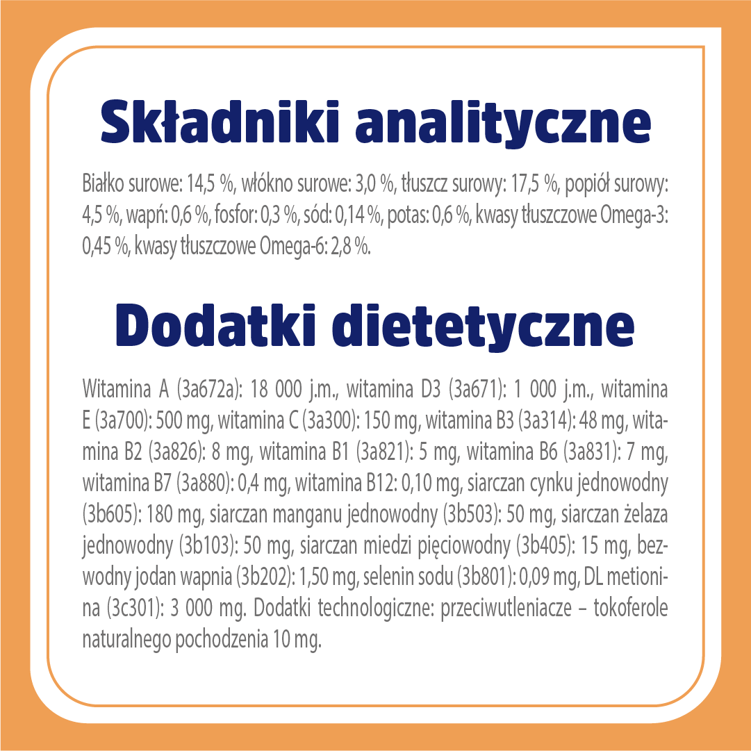Składniki analityczne: białko surowe: 14,5 %, włókno surowe: 3,0 %, tłuszcz surowy: 17,5 %, popiół surowy: 4,5 %, wapń: 0,6 %, fosfor: 0,3 %, sód: 0,14 %, potas: 0,6 %, kwasy tłuszczowe Omega-3: 0,45 %, kwasy tłuszczowe Omega-6: 2,8 %.