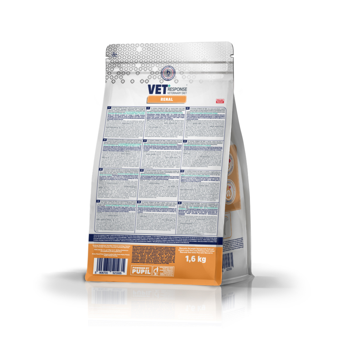 - Karma sucha dla psa VET RESPONSE VETERINARY DIET RENAL 1,6 kg VET RESPONSE VETERINARY DIET RENAL to dietetyczna, pełnoporcjowa karma sucha dla psów dorosłych, wspomagająca funkcjonowanie nerek, w...