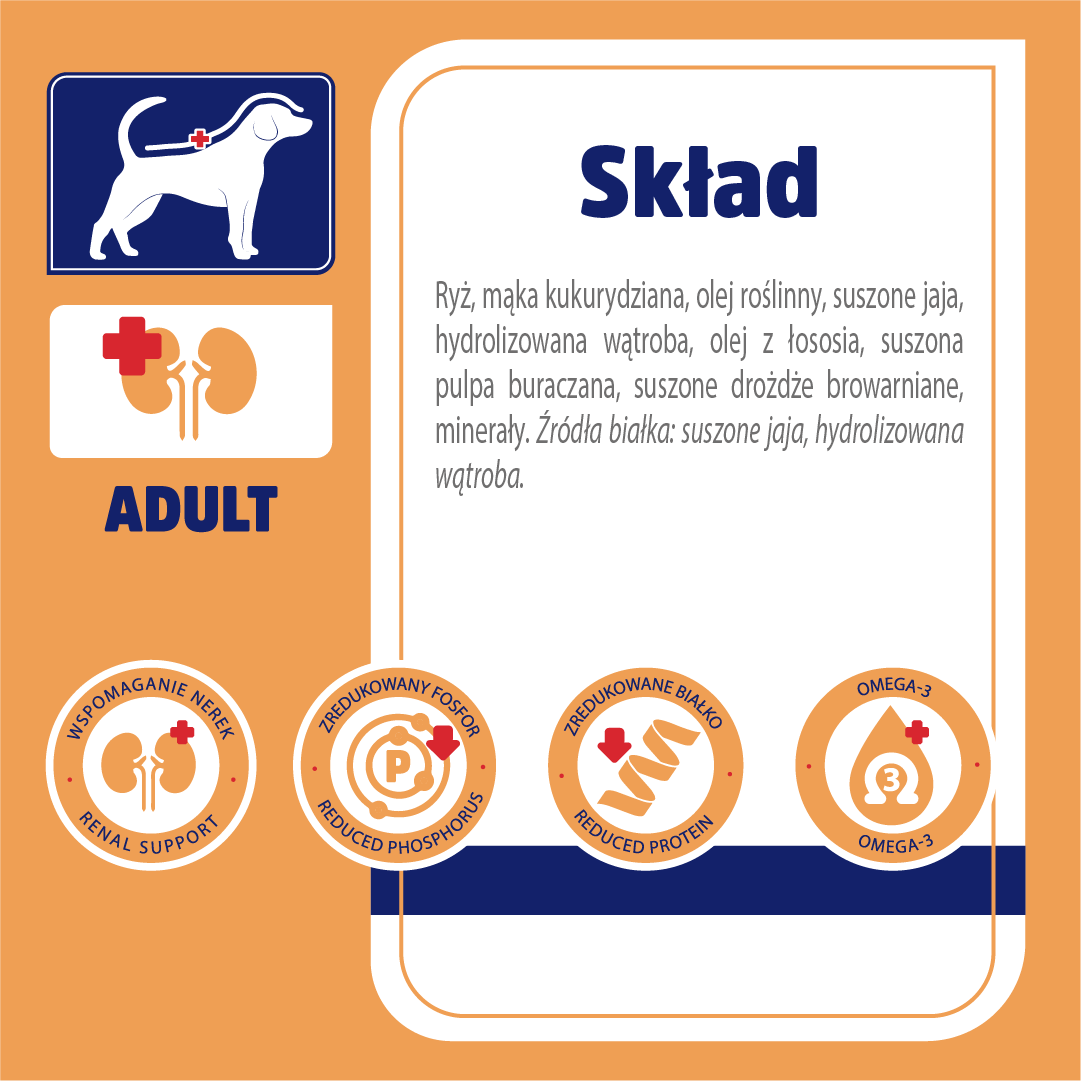 - Pełnoporcjowy posiłek dietetyczny w postaci suchej karmy dla psów cierpiących na przewlekłą i czasową niewydolność nerek