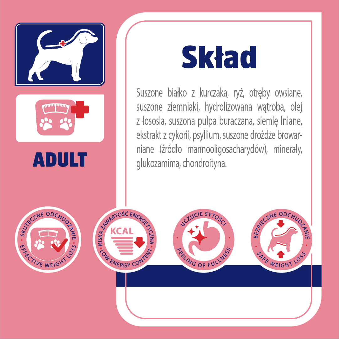 • Pełnoporcjowy posiłek dietetyczny w postaci suchej karmy dla psów  wspierający bezpieczną utratę masy ciała, pomaga utrzymać prawidłową wagę zwierzęcia, jak również po utracie zbędnych kilogramów.