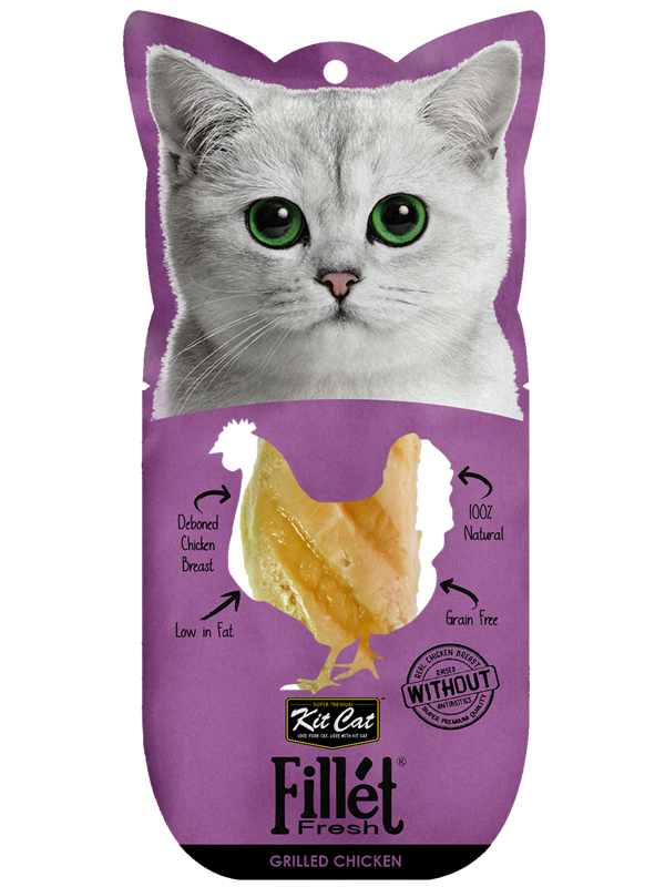 Kit Cat Fillet Fresh Grillowany KurczakPrzysmaki Kit Cat są tworzone ze starannie dobieranych i ręcznie przygotowywanych naturalnych składnikw - niskotłuszczowe mięso kurczaka lub ryby bogate w kwasy Omega-3 i Omega-6.Receptura Kit Cat nie zawiera barwnikw, konserwantw, zbż, ani soli. Jest przeznaczona dla kotw na wszystkich etapach życia.Bezzbożowa, pyszna i w 100% naturalna przekąska gwarantuje smakowitą i zdrową ucztę dla Twojego kota.Jakość używanych składnikw na poziomie Human Grade, czyli najwyższa - taka sama, jak dla ludzi.Przysmaki dla kota Kit Cat opracowali dietetycy, ktrzy jednocześnie są miłośnikami kotw.Przekąski Kit Cat są przygotowywane z myślą o najbardziej wymagających kocich podniebieniach.Zalety przysmakw Kit Cat:W 100% naturalne, na bazie najwyższej jakości składnikw (Human Grade).Nie zawierają: zbż, soli, barwnikw i konserwantw.Z mięsa kurczaka o niskiej zawartości tłuszczu.Z ryb bogatych w kwasy Omega.Odpowiednie dla kotw w każdym wieku.Przysmaki tworzone pod kontrolą kocich dietetykw.Pakowane prżniowo - gwarancja świeżości.Skład:Pozbawiony kości kurczakAnaliza:Białkomin. 25%Tłuszczmin. 1%Włknomax. 1%Popiłmax. 3%Wilgotnośćmax. 65%Energiametaboliczna136,72 kcal/100gZalecenia żywieniowe:Podawać jako uzupełnienie codziennej diety. Ilość powinna być dostosowana do wieku, wagi i poziomu aktywności kota.Podawać w temperaturze pokojowej. Nie podgrzewać saszetki w mikrofali.Przechowywać w chłodnym i suchym miejscu. Po otwarciu przechowywać w lodwce maksymalnie przez 2 dni.Zapewnij kotu świeżą wodę do picia.