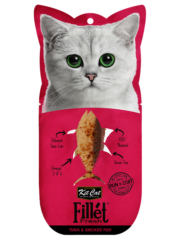 Kit Cat Fillet Fresh Tuńczyk Wędzona RybaPrzysmaki Kit Cat są tworzone ze starannie dobieranych i ręcznie przygotowywanych naturalnych składnikw - niskotłuszczowe mięso kurczaka lub ryby bogate w kwasy Omega-3 i Omega-6.Receptura Kit Cat nie zawiera barwnikw, konserwantw, zbż, ani soli. Jest przeznaczona dla kotw na wszystkich etapach życia.Bezzbożowa, pyszna i w 100% naturalna przekąska gwarantuje smakowitą i zdrową ucztę dla Twojego kota.Jakość używanych składnikw na poziomie Human Grade, czyli najwyższa - taka sama, jak dla ludzi.Przysmaki dla kota Kit Cat opracowali dietetycy, ktrzy jednocześnie są miłośnikami kotw.Przekąski Kit Cat są przygotowywane z myślą o najbardziej wymagających kocich podniebieniach.Zalety przysmakw Kit Cat:W 100% naturalne, na bazie najwyższej jakości składnikw (Human Grade).Nie zawierają: zbż, soli, barwnikw i konserwantw.Z mięsa kurczaka o niskiej zawartości tłuszczu.Z ryb bogatych w kwasy Omega.Odpowiednie dla kotw w każdym wieku.Przysmaki tworzone pod kontrolą kocich dietetykw.Pakowane prżniowo - gwarancja świeżości.Skład:Polędwica tuńczyka pozbawiona ości, woda, wędzone płatki rybne, ekstrakt z tuńczykaAnaliza:Białkomin. 23%Tłuszczmin. 0,5%Włknomax. 1%Popiłmax. 3%Wilgotnośćmax. 75%Energiametaboliczna112,79 kcal/100gZalecenia żywieniowe:Podawać jako uzupełnienie codziennej diety. Ilość powinna być dostosowana do wieku, wagi i poziomu aktywności kota.Podawać w temperaturze pokojowej. Nie podgrzewać saszetki w mikrofali.Przechowywać w chłodnym i suchym miejscu. Po otwarciu przechowywać w lodwce maksymalnie przez 2 dni.Zapewnij kotu świeżą wodę do picia.