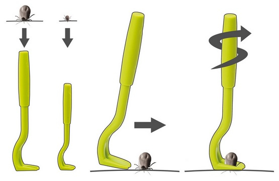 Aby wykręcić pasożyta należy bardzo lekko unieść haczyk i 2-3 razy przekręcić uchwyt. Operacja trwa zaledwie kilka sekund i wymaga jedynie użycia środka dezynfekującego po wyjęciu kleszcza.