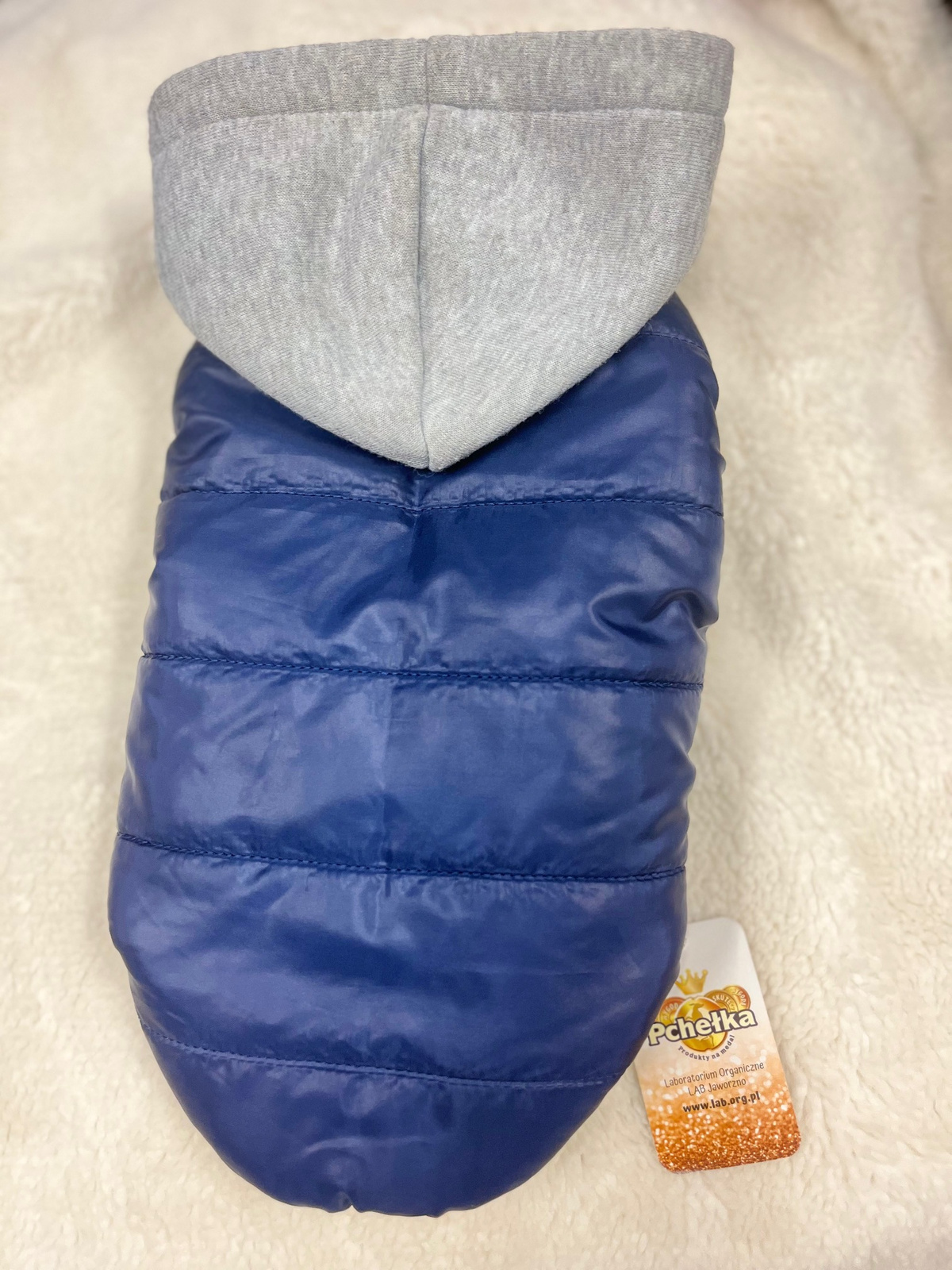 - Kurtka dla pieska w sam raz na jesień ocieplana z nieprzemakalnego materiału z dzianinowym kapturkiem
