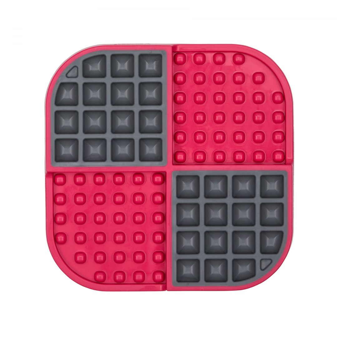 - LickiMat® SLOMO to najbardziej uniwersalna wersja- mata jest podzielona na 4 strefy. 2 strefy o większych polach przeznaczone są do serwowania większych kawałków mięsa czy ryb, karmy suchej lub przysmaków. Pozostałe 2 strefy zaprojektowane zostały do poda