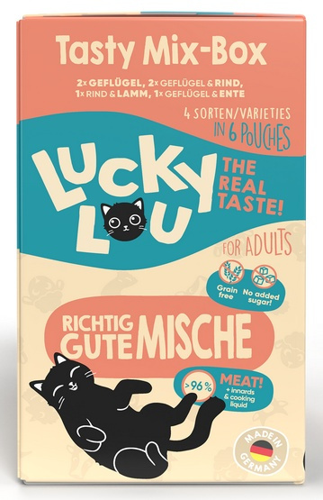 - Lucky Lou Lifestage Adult Tasty Mix-Box Lucky Lou Lifestage jest karmą pełnoporcjową dla kotów. Nie zawiera zbóż ani cukru. Mokre, wysokiej jakości jedzenie, które przypadnie do gustu kocim...