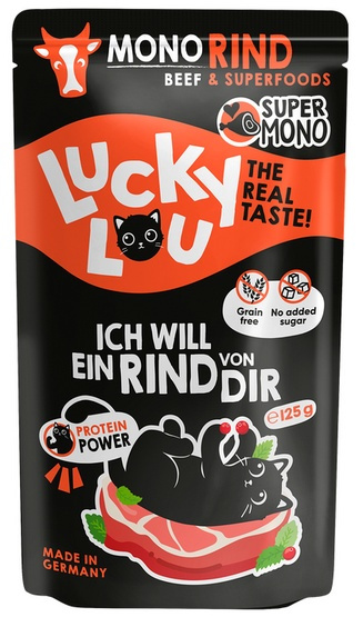 - Lucky Lou SuperMono Wołowina Lucky Lou Supermono jest karmą pełnoporcjową dla kotów. Nie zawiera zbóż ani cukru. Mokre, wysokiej jakości jednobiałkowe jedzenie, które przypadnie do gustu kocim...