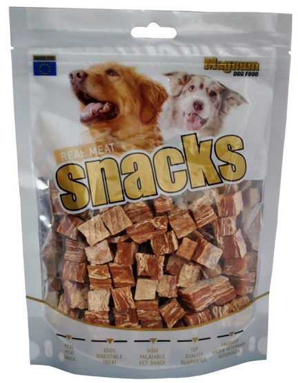 - Magnum Kostki z kurczaka i dorsza (Chicken & COD Cubes) Uzupełniająca karma dla psów - miękki i smaczny przysmak do podawania jako nagroda. Skład: mięso z kurczaka, mięso ryby, skrobia, białko...