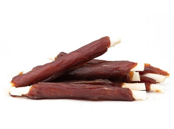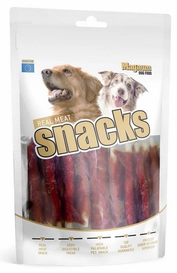 - Magnum Patyczki ze skóry bydlęcej z kaczką (Duck roll on Rawhide stick) Uzupełniająca karma dla psów - miękki i smaczny przysmak do podawania jako nagroda. Skład: mięso kaczki, skóra wołowa,...