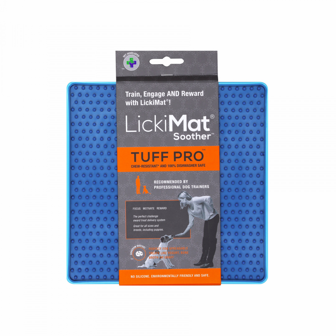 Mata LickiMat® SOOTHER TUFF to twarda wersja maty Soother. Posiada wypustkową strukturę, dlatego idealnie sprawdza się serwowania półpłynnych przekąsek o konsystencji zbliżonej do jogurtu czy sosu. Rozprowadź na macie karmę mokrą o luźniejszej konsystencji (niektóre rodzaje karm pozwalają nawet na rozrabianie ich z wodą) i podaj psu. Zapewnisz mu wiele radości.