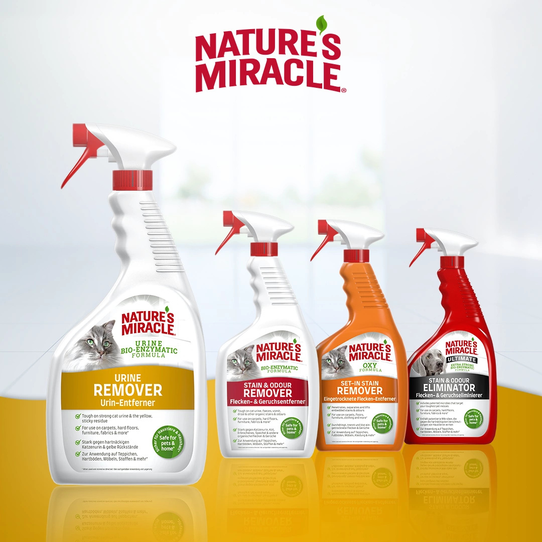 Nature's Miracle® Urine Remover Cat to produkt do zwalczania uporczywych zabrudzeń z moczu kota, skuteczny w usuwaniu moczu oraz jego pozostałości w postaci żółtego, lepkiego osadu. Bioenzymatyczna formuła oparta na bakteriach wytwarza enzymy, które usuwają organiczne plamy i działają tak długo, dopóki nie usuną plam z moczu, a zapach nie zostanie zneutralizowany.