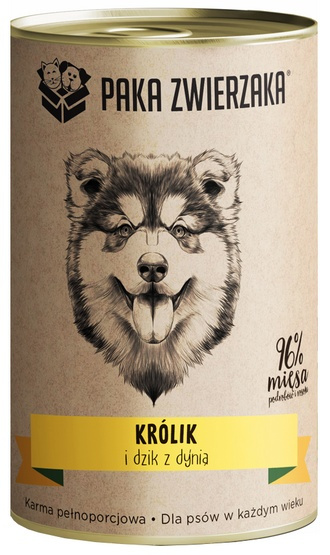 - PAKA ZWIERZAKA Królik i dzik z dynią Naturalna karma mokra jest kompletnym i zbilansowanym posiłkiem dla psiaków w każdym wieku. Zawiera aż 96% królika z rosołem i dzika! Przygotowana z najwyższej...