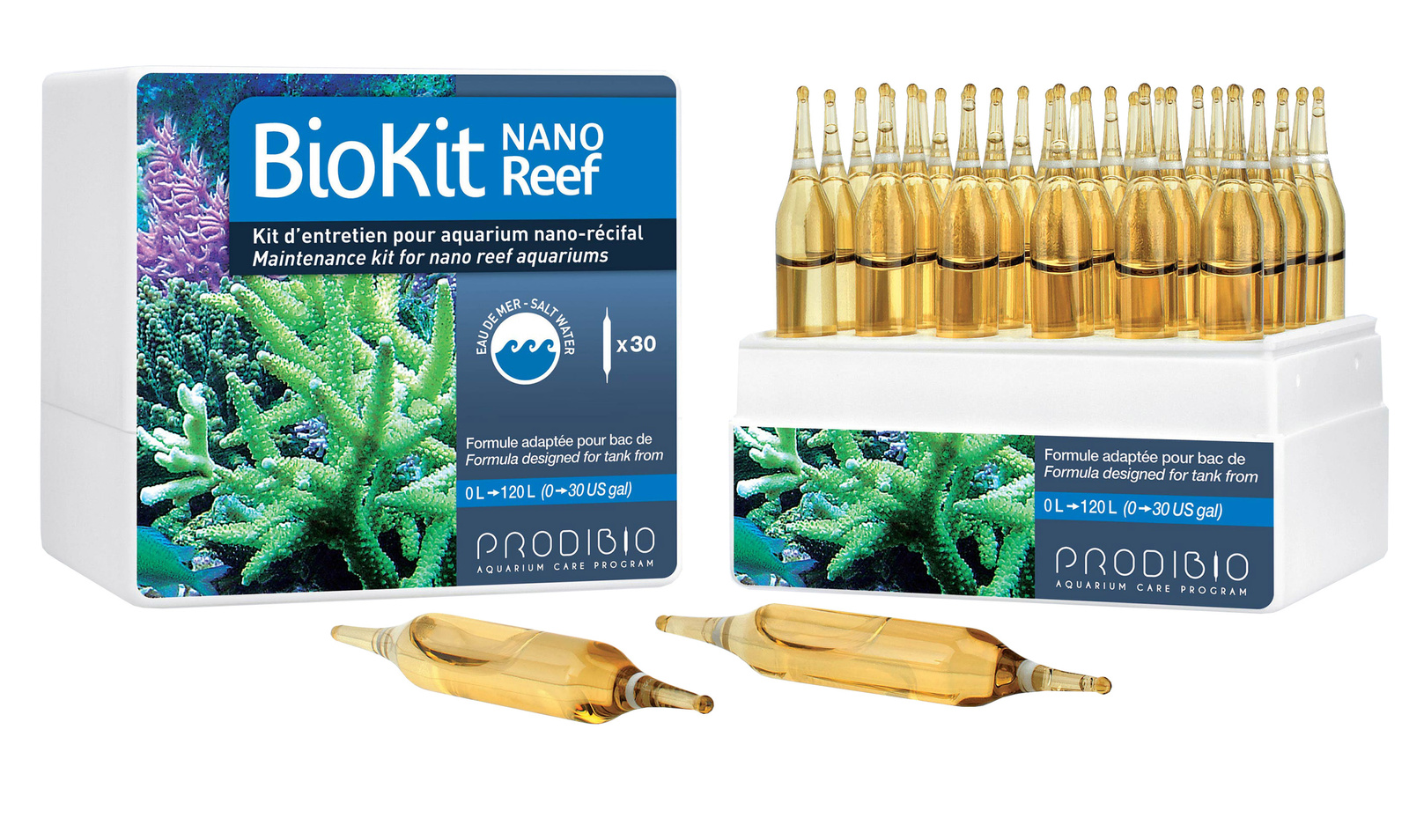 BIOKIT REEF NANO zawiera wszystkie produkty Prodibio niezbędne do utrzymania akwarium z nano rafą: