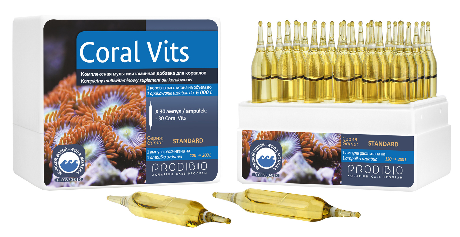 CORAL VITS jest skoncentrowanym roztworem zawierającym wszystkie witaminy niezbędne do dobrego wzrostu korali i dobrego samopoczucia ryb w zbiornikach z wodą morską i z rafą. Produkt nie grozi dostarczeniem nadmiaru witamin (sprawdź w instrukcji). Dzięki opatentowanej technologii Neogoutte® zastosowanej w fiolkach firmy Prodibio CORAL VITS zapewnia ochronę rozpuszczalnych w wodzie witamin (B1 , B2, B3 ( lub PP) , B4 , B5, B6 , B7 , B8 (lub H) , B9 (lub Bc) , B12), jak również witamin lipofilicznych (A, C palmitynian , D2 , D3 , E, K1 , K2 oraz K3). Co więcej, uwalnianie tych witamin w zbiorniku odbywa się stopniowo, co pozwala na optymalne przyswojenie ich przez organizmy morskie.