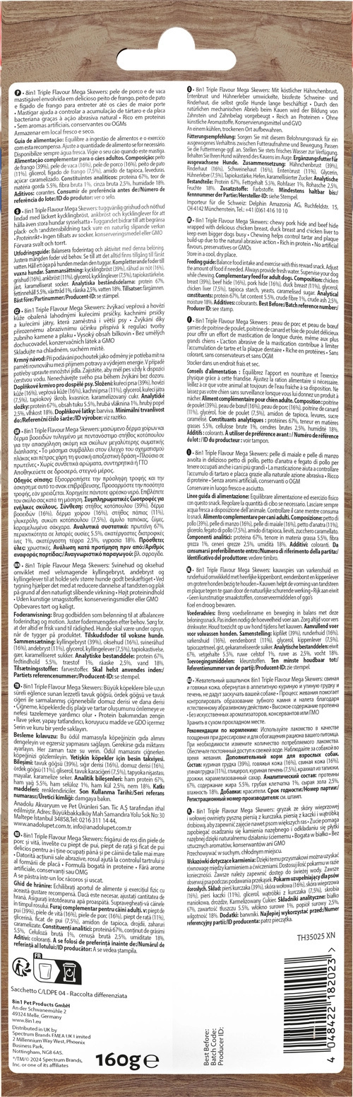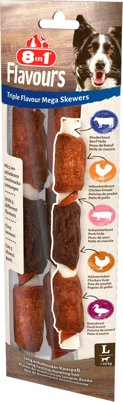8in1 Triple Flavour Mega Skewers – Smaczne i Zdrowe Żucie Dla Twojego Psa 8in1 Triple Flavour Mega Skewers to wyjątkowe szaszłyki do żucia, które łączą w sobie pyszne smaki i naturalne składniki. Ten innowacyjny gryzak składa się z warstw skóry wieprzowej i wołowej owiniętej w apetyczną pierś z kurczaka, pierś z kaczki oraz wątróbkę z kurczaka, oferując psu niezwykłe doznania smakowe. Przeznaczony dla średnich i dużych psów, produkt zapewnia długotrwałą rozrywkę oraz wspomaga zdrowie zębów i dziąseł dzięki naturalnym właściwościom ścierającym. Najważniejsze zalety produktu Trzy smakowe warstwy: Kompozycja piersi z kurczaka (39%), skóry wieprzowej i wołowej (po 16%), piersi kaczki (11%) oraz wątróbki z kurczaka (7,5%) tworzy niezrównany przysmak, który przyciąga nawet najbardziej wybredne psy. Wspiera higienę jamy ustnej: Żucie szaszłyków wspiera naturalne ścieranie płytki bakteryjnej i kamienia nazębnego, dzięki czemu poprawia zdrowie zębów i dziąseł psa*. Skład jakości premium: Gryzak został stworzony na bazie naturalnych produktów i pozbawiony sztucznych aromatów, konserwantów oraz GMO. Bogaty w białko: Zawartość aż 67% białka zapewnia energię i wspiera zdrowy rozwój psa. Minimalna zawartość tłuszczu: Tylko 5,5% tłuszczu sprawia, że produkt jest lekkostrawny i odpowiedni nawet dla psów z tendencją do nadwagi. Długotrwała zabawa: Twarda i wytrzymała struktura szaszłyka zapewnia psu zajęcie na długi czas, minimalizując nudę i jednocześnie zaspokajając naturalne potrzeby żucia. Informacje o składzie i wartościach odżywczych Skład: Pierś kurczaka (39%), skóra wołowa (16%), skóra wieprzowa (16%), pierś kaczki (11%), glicerol, wątróbki z kurczaka (7,5%), skrobia maniokowa, drożdże, karmelizowany cukier. Składniki analityczne: Białko surowe: 67% Tłuszcz surowy: 5,5% Włókno surowe: 1% Popiół surowy: 2,5% Wilgotność: 18% Dodatki: Barwniki Zalecenia dotyczące podawania Produkt jest odpowiedni dla psów średnich i dużych ras. Zaleca się podawać go zgodnie z poniższymi wytycznymi, przy jednoczesnym dostosowaniu dziennej dawki kalorii w diecie psa. Średnie psy (10-25 kg): 1 szaszłyk co 4 dni. Duże psy (25-40 kg): 1 szaszłyk co 2 dni. Bardzo duże psy (>40 kg): Do 1 szaszłyka dziennie. Niezalecane dla psów <10 kg. Zawsze zapewnij psu dostęp do świeżej wody i obserwuj go podczas jedzenia, aby upewnić się, że produkt jest użytkowany bezpiecznie. Dlaczego warto wybrać 8in1 Triple Flavour Mega Skewers? 8in1 Triple Flavour Mega Skewers to synonim jakości, smaku i zdrowia. Wysoka zawartość naturalnych składników, brak sztucznych dodatków, a także korzyści dla zdrowia zębów i dziąseł sprawiają, że jest to idealny wybór dla troskliwych właścicieli psów. Ten wyjątkowy gryzak zapewnia psu długotrwałą przyjemność żucia, jednocześnie dbając o jego kondycję i witalność. Wybierz 8in1 Triple Flavour Mega Skewers i podaruj swojemu pupilowi wyjątkową nagrodę na co dzień!