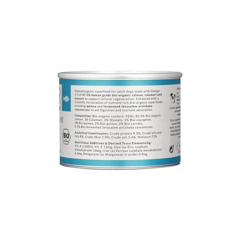 To unikalna receptura wymagająca delikatnego gotowania w celu zachowania ważnych składników odżywczych i witamin. Karma zawiera 82,5% organicznego łososia oraz kalmary i małże. Niezbędne dodatkowe składniki odżywcze są dostarczane dzięki starannie opracowanej mieszance organicznych składników superfoods, w tym cukinii, komosy ryżowej, pigwy i marchwi, tworząc zrównoważone i smaczne pożywienie o wielu korzyściach zdrowotnych.
