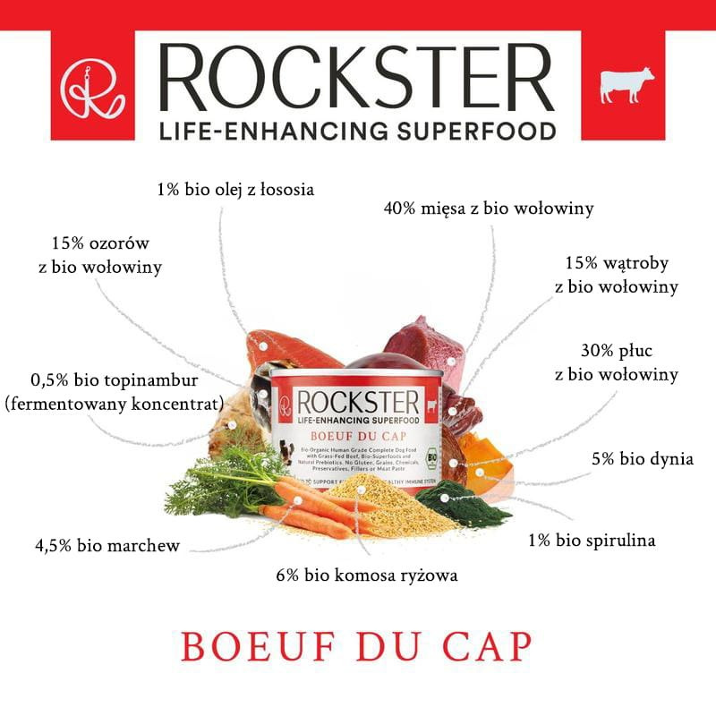 - ROCKSTER SUPERFOOD BOEUF DU CAP Bio-Wołowina Organiczna, certyfikowana, kompletna mokra karma dla dorosłych psów. FORMUŁA NAUKOWA WSPIERAJĄCA WZROK i SYSTEM ODPORNOŚCIOWY